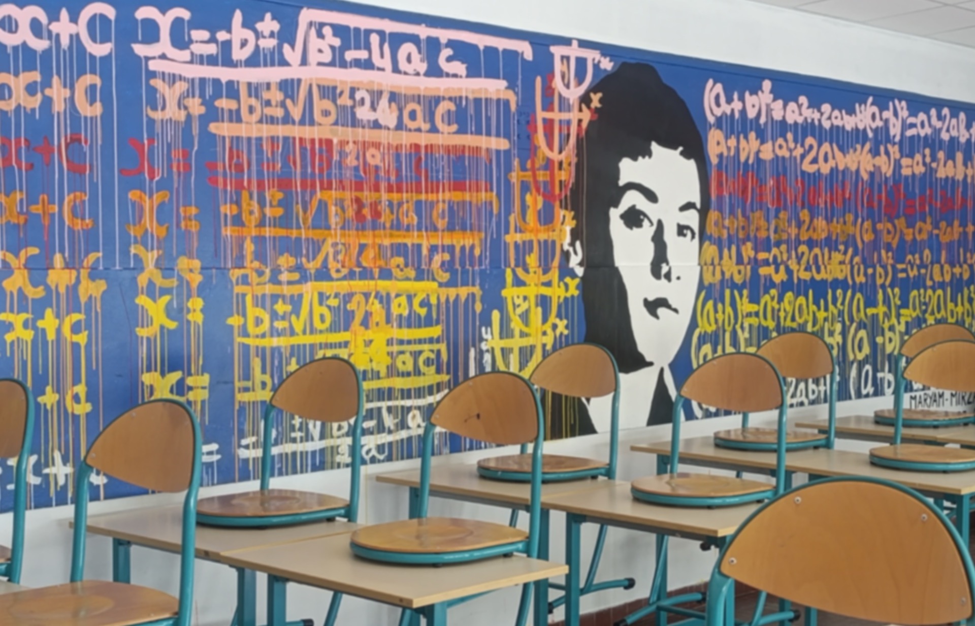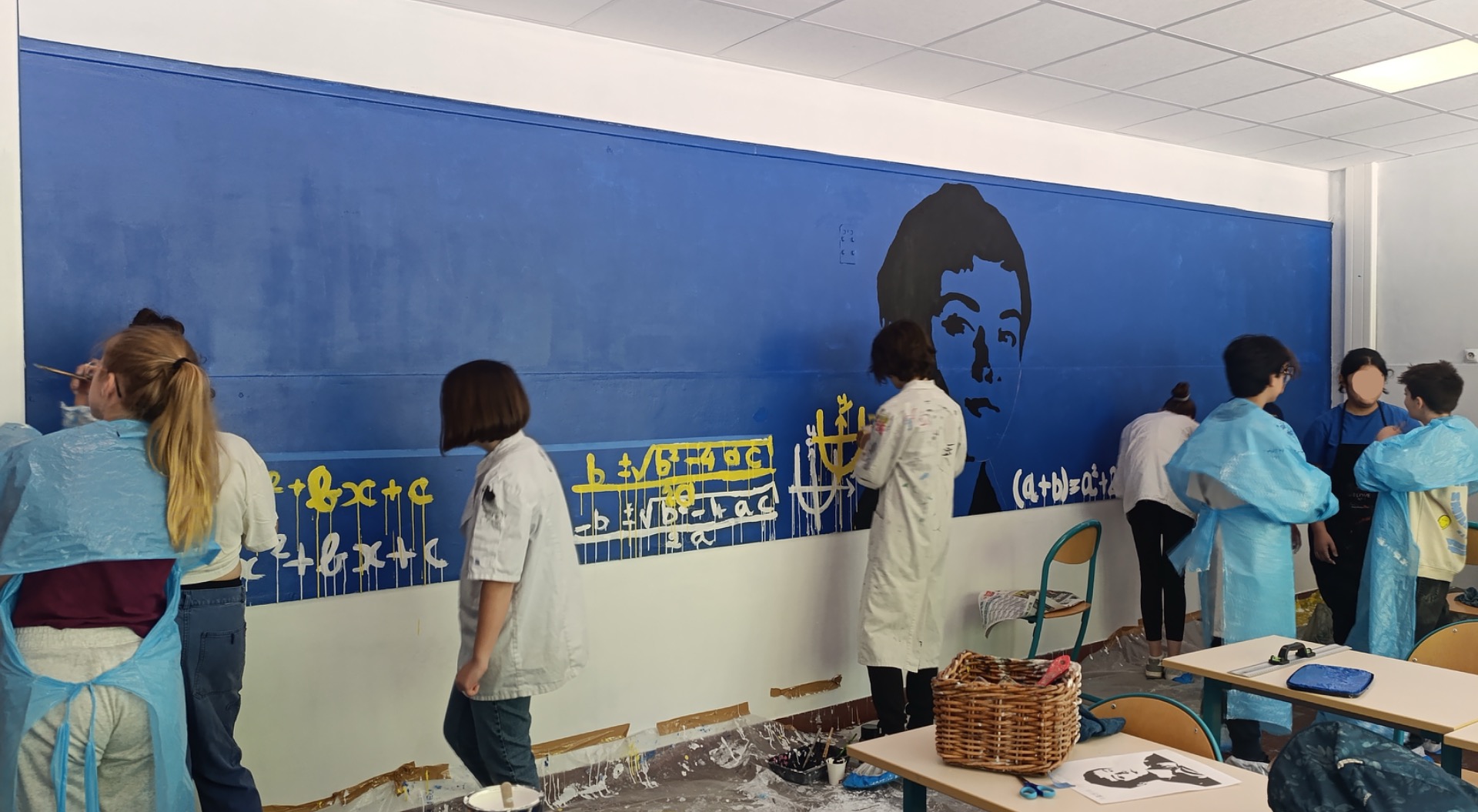 Après la visionnage d’un court film sur sa vie et une discussion sur le sens de notre action, les élèves ont été invités à peindre son portrait et des formules de mathématiques choisies par le professeur selon un système d’harmonie de couleurs que je leur ai proposé. La fresque a été réalisée en une seule journée. Les élèves avaient préalablement peint le mur en bleu avec Mme Duval, leur professeure d’arts plastiques.