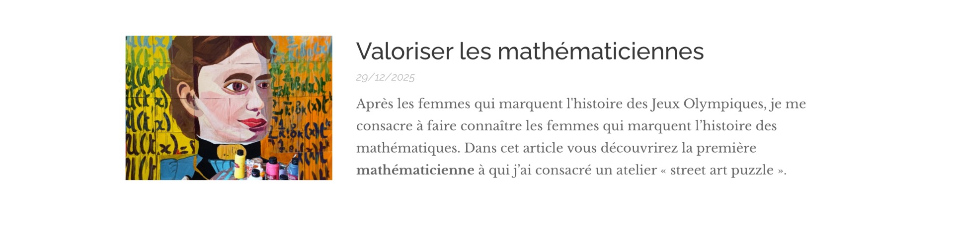 En parallèle de mes ateliers « fresque puzzle » sur Sofia Kovaleskaïa et Maryam Mirzakhani, je propose un atelier qui mêle art et mathématiques. Il s’intitule : « Peins les mathématiques à la manière du street art ». Cet atelier se réalise individuellement sur des petits formats sur table. Il permet l’acquisistion de nombreuses compétences.